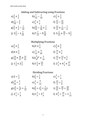 Fraction Tests and Worksheets - ThoughtCo Worksheet 1. D. Russell. Print the PDF: mixed operations and compare the fractions This test or worksheet provides fraction problems involving mixed operations, requiring adding, subtracting, multiplying, and dividingIf you are using this printable as a test, you'll find out whether students understand when they need to find a common denominator before working the fraction problems.